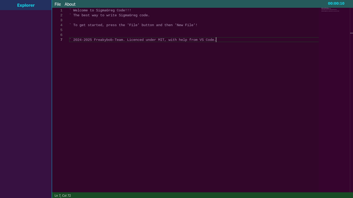 SigmaGreg was a coding language developed by 5quirre1 at Freakybob Team on December 21, 2024. It started out as a shitty C++ "coding language" but soon stopped getting updates due to C++ taking time and effort to make new updates.